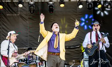 Sunday afternoon is a fresh beginning. The Night Bumpers kick it oe [sic]. Jumpin Jack Bluni in his signatory canary yellow sports coat and tie with hawkish feeds oe [sic] his harmonica to color his lead vocals; Gary Hamor plays a bass that looks like a ukulele and sounds like an electrified stand-up bass; Liam Sorrell on guitar; John Putnam on keys and guitar – all of whom add lead and back-up vocals, and Mike LaSala on drums. They’re local. And bring a fabulous interpretation of jump swing blues to the stage for a good hour."