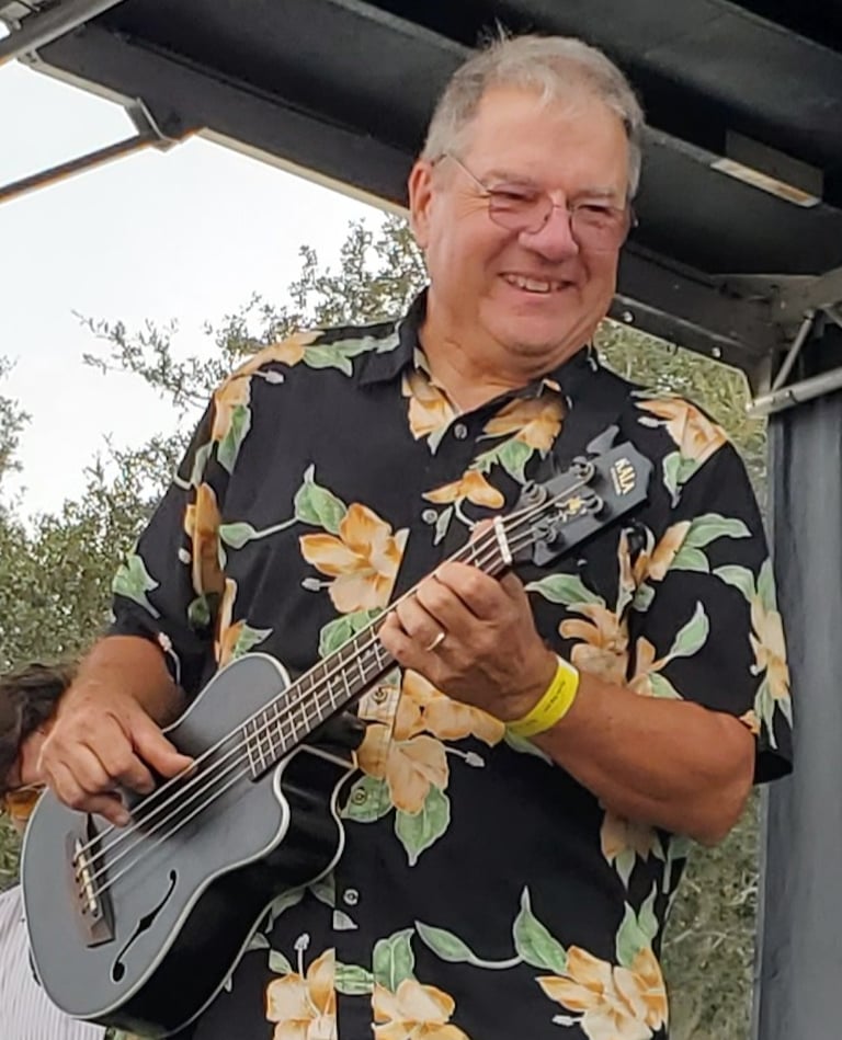 Even before he started playing bass in 1967, Gary Hamor has always liked tunes that groove, especially ones with walking bass lines. Once he figured out that "blues" was synonymous with "grooves", he was hooked! Gary plays a tuba, upright bass as well as fretted and fretless electric basses. His latest acquisition is the Kala UBASS shown here, which has a sound very close to upright, but is SO much easier to transport! Gary keeps his bass lines simple, and always in the pocket, establishing the tonal foundation for the other band members to add their magic.